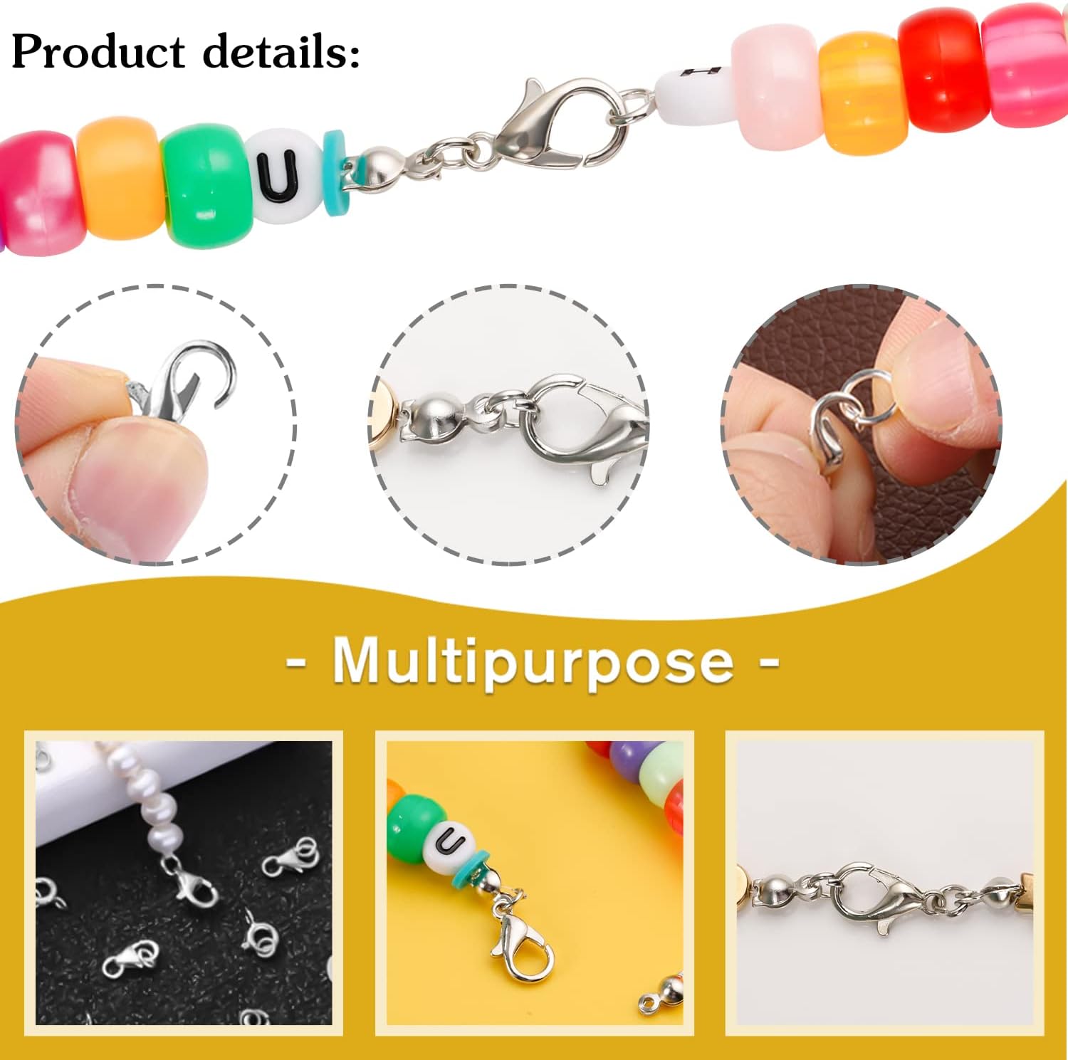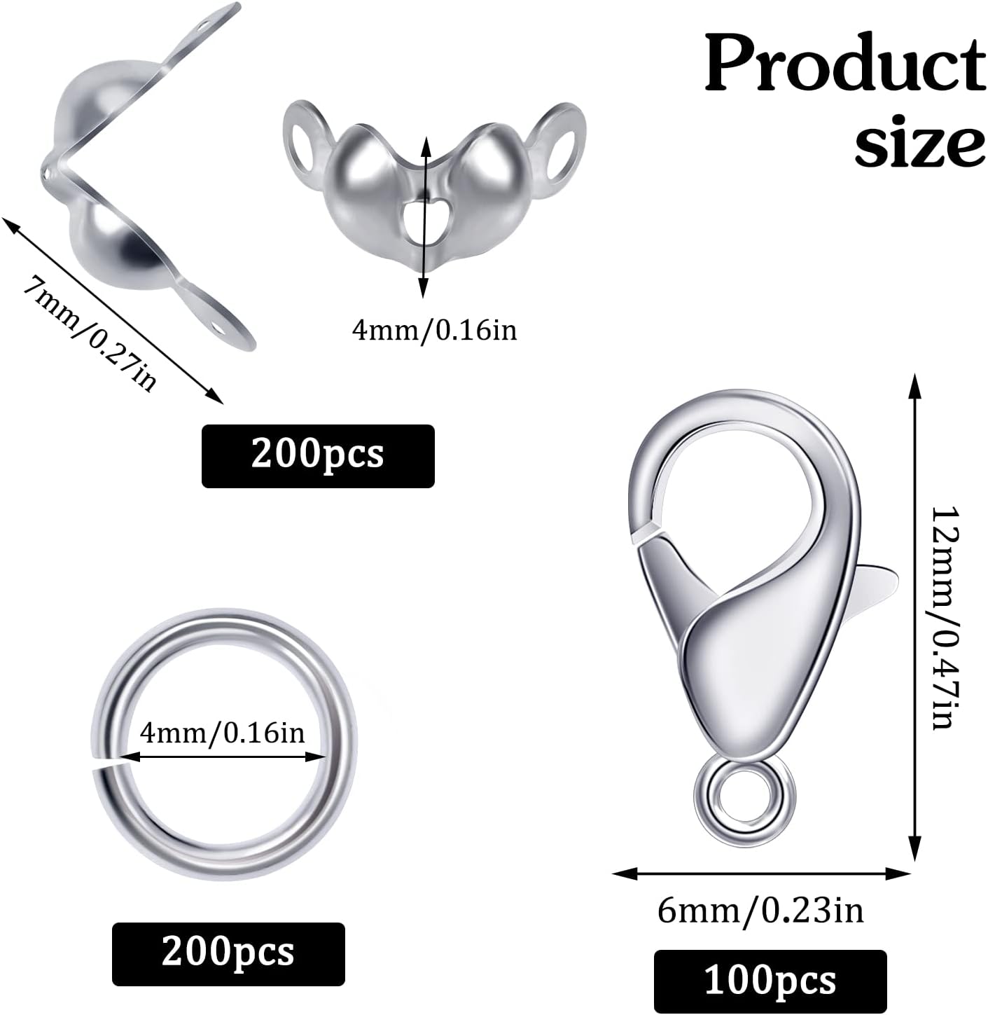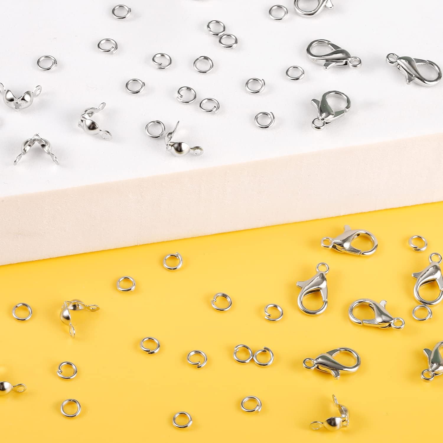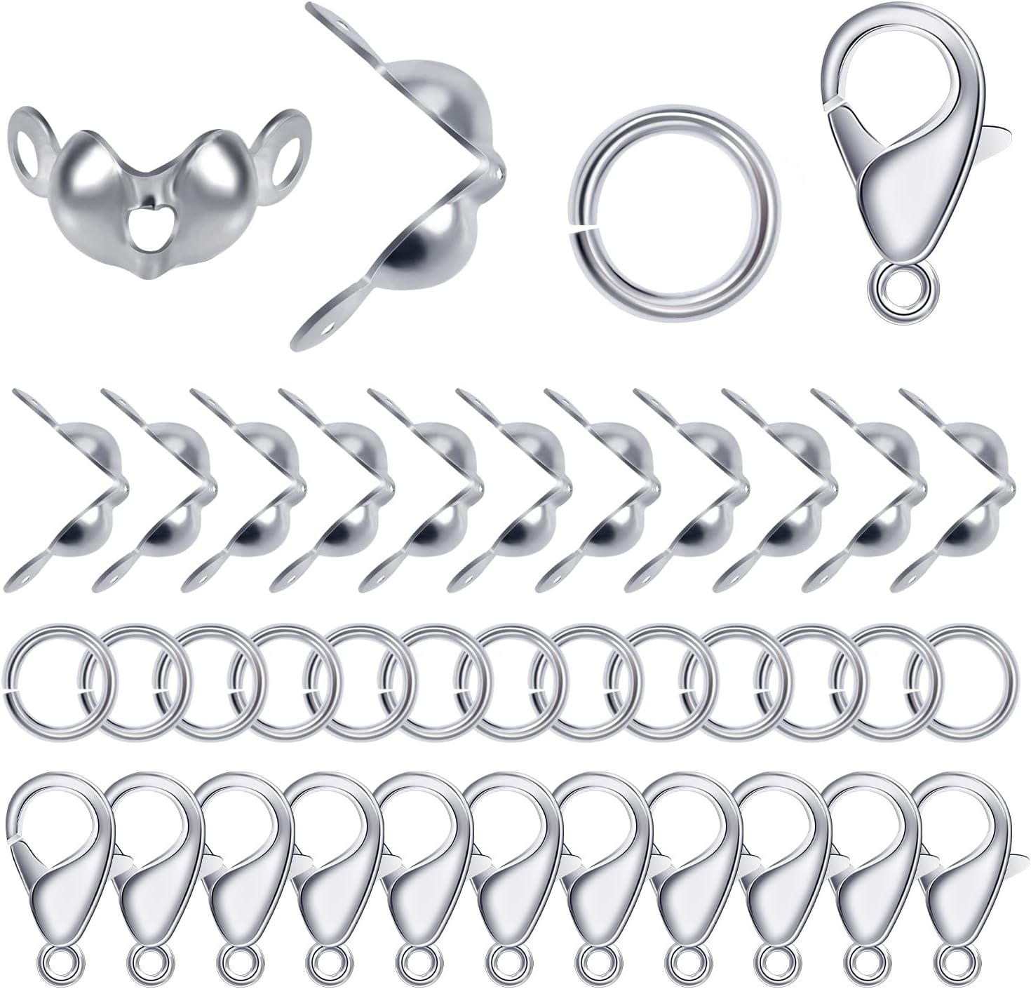 Introducing the ultimate Jewelry Making Accessories Set, perfect for DIY crafts and creating your own stunning jewelry pieces. This set includes 100 Pcs of high-quality Lobster Claw Clasps, 200 Pcs of sturdy Open Jump Rings, and 200 Pcs of elegant Bead Tip Knot Caps, all in a beautiful silver finish.